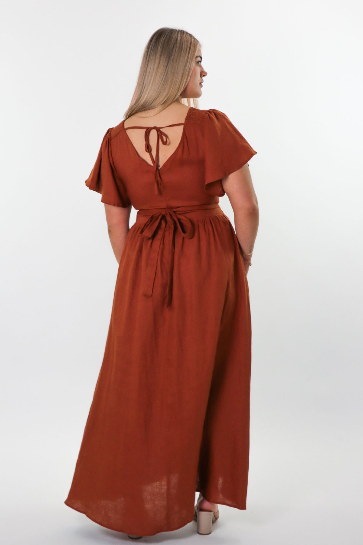 The Phoebe Dress in 100% Linen. Cut out waist ties create an elegant nipped waist tailored to your form. Soft elastic features and floaty fit and flare makes this dress effortlessly elegant for a range of body types