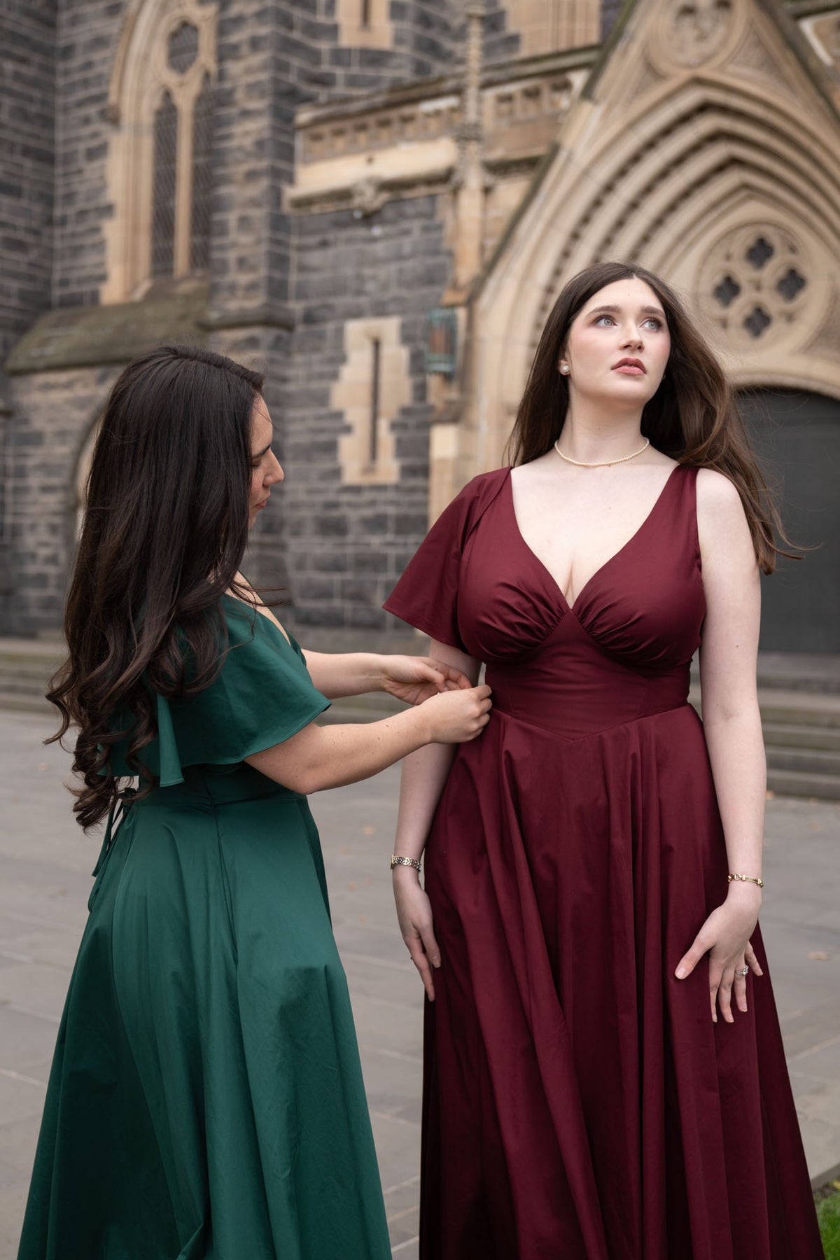 The Estelle Dress is the epitome of timeless elegance with a modular twist! Removable flutter sleeves and adjustable straps give you styling versatility, while the corset-style back lacing allows for a perfectly tailored silhouette. Crafted from lustrous cotton sateen, structured and breathable. Made for formal events and occasions that call for something unforgettable.