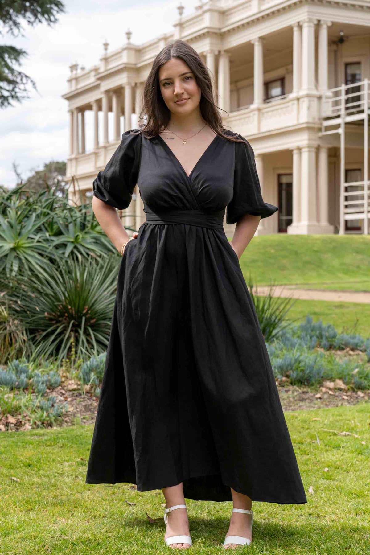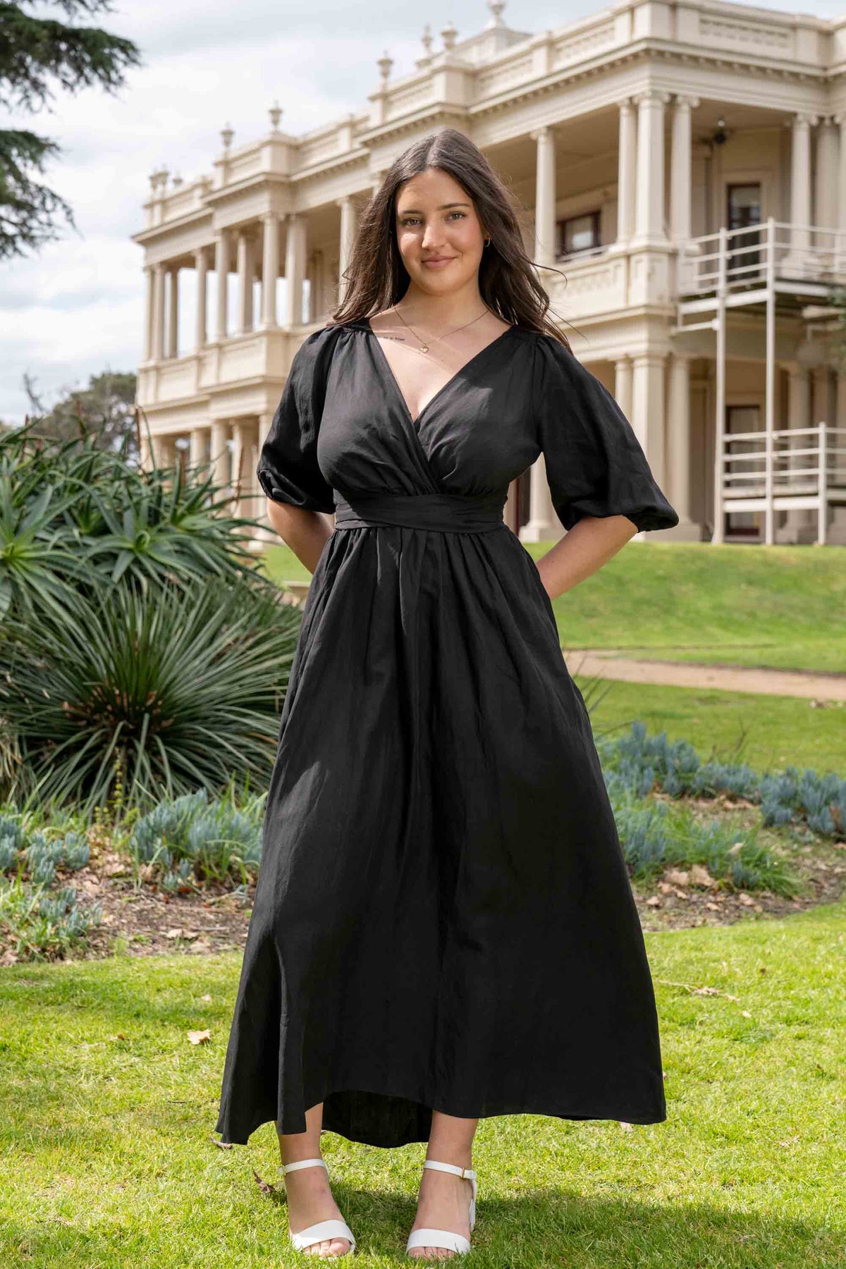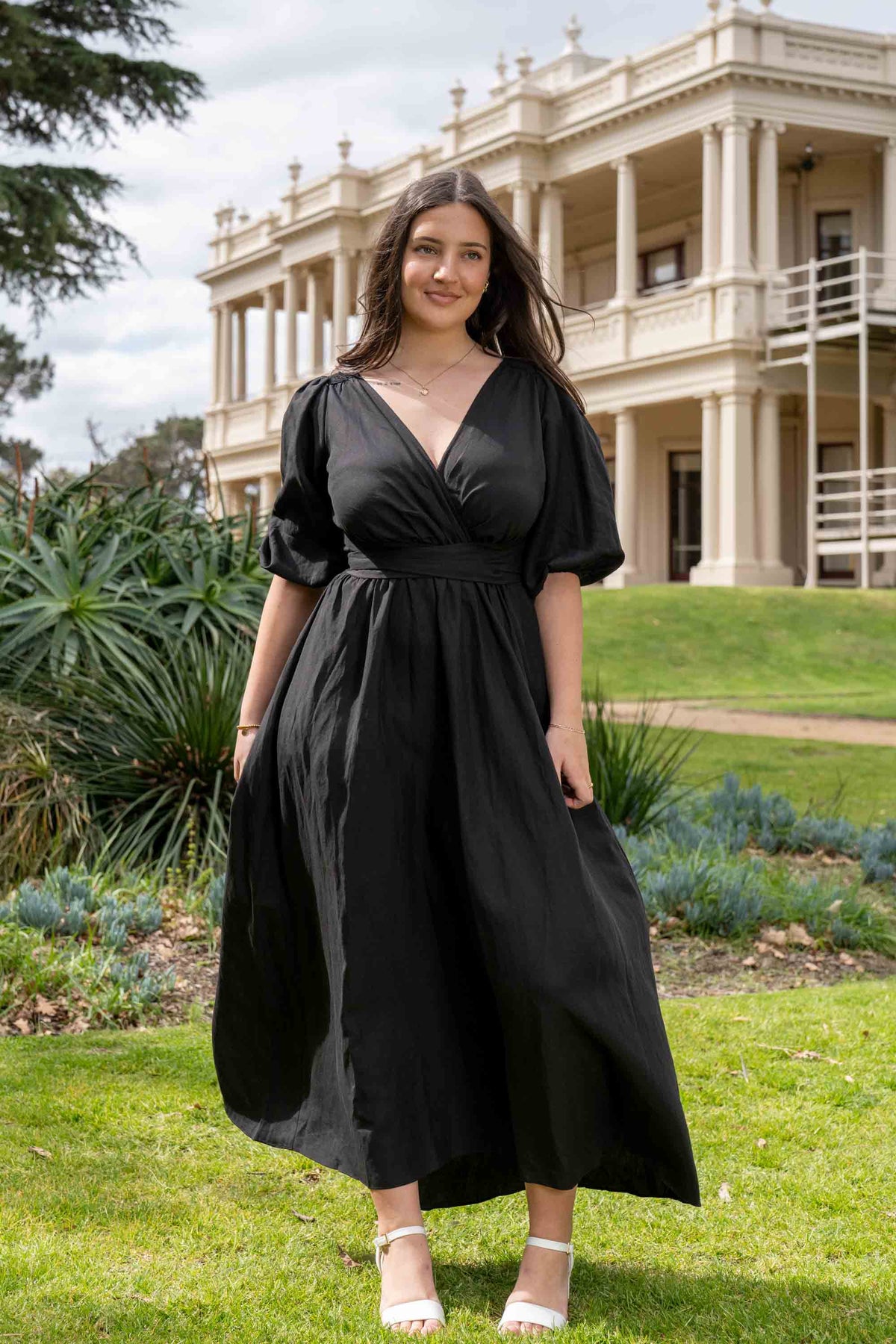 The Jeanette Dress in Black Tencel Linen. Cut out waist ties create an elegant nipped waist tailored to your form. Soft elastic features and floaty fit and flare makes this dress effortlessly elegant for a range of body types